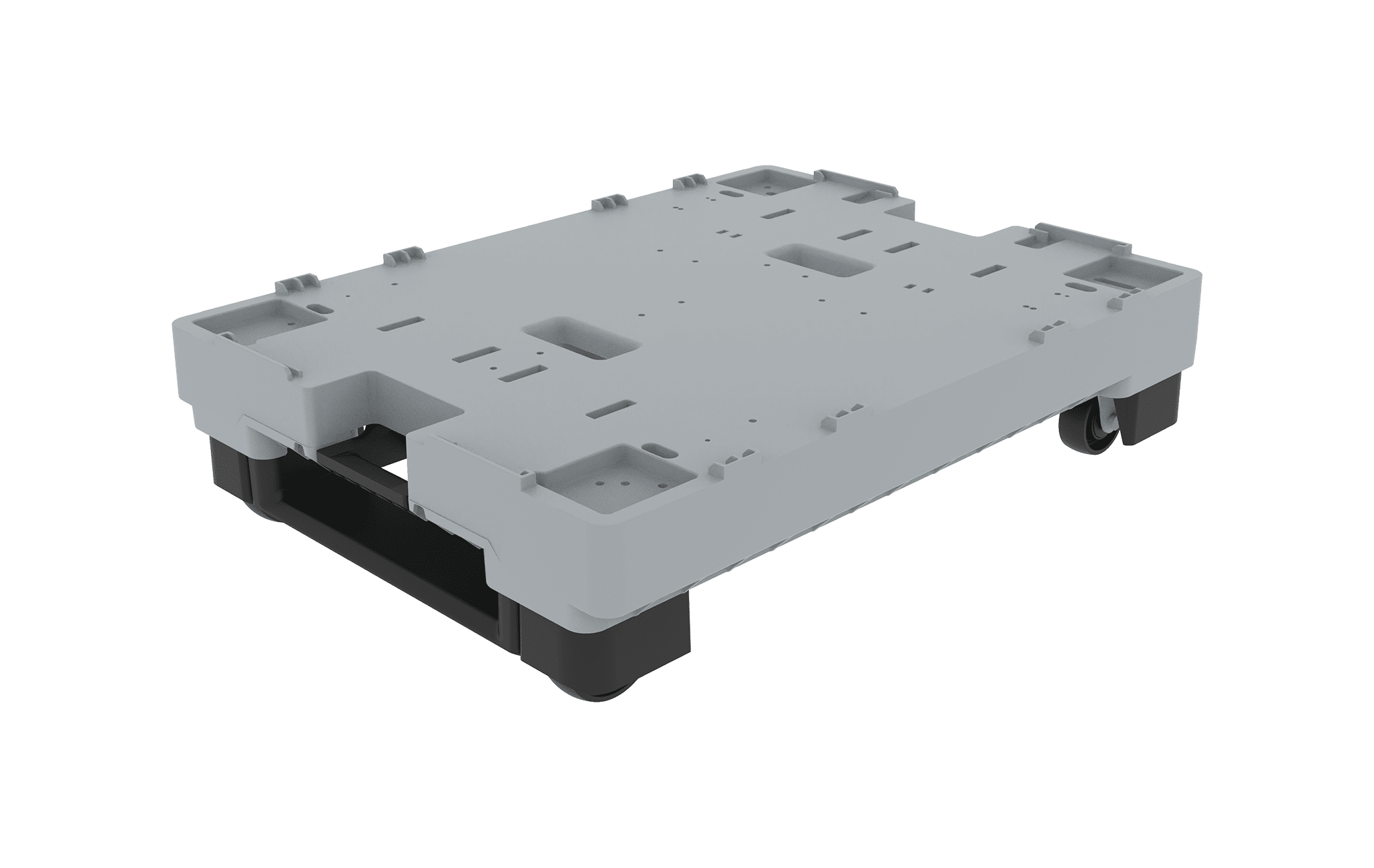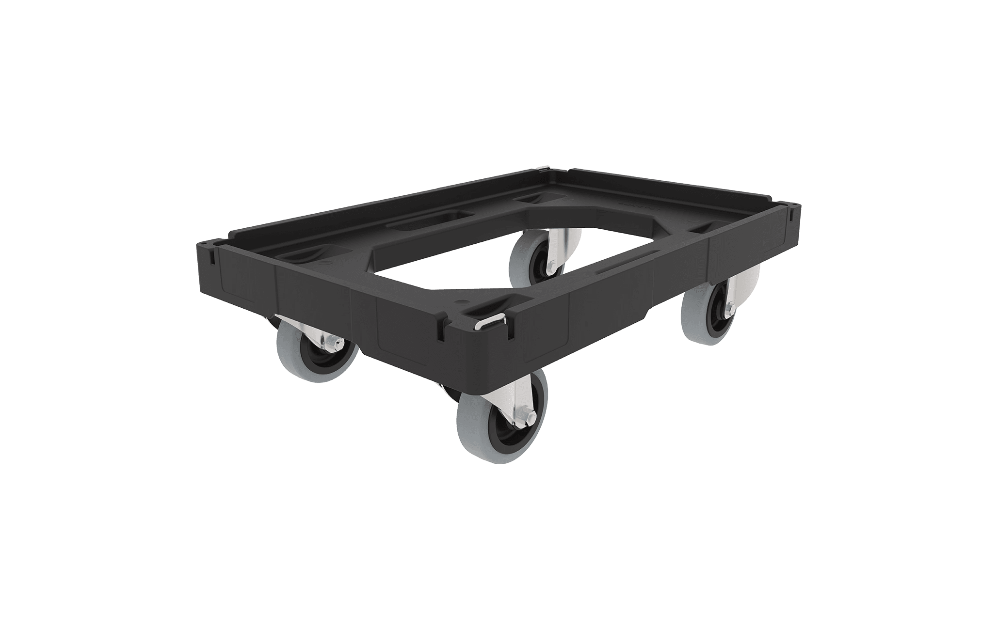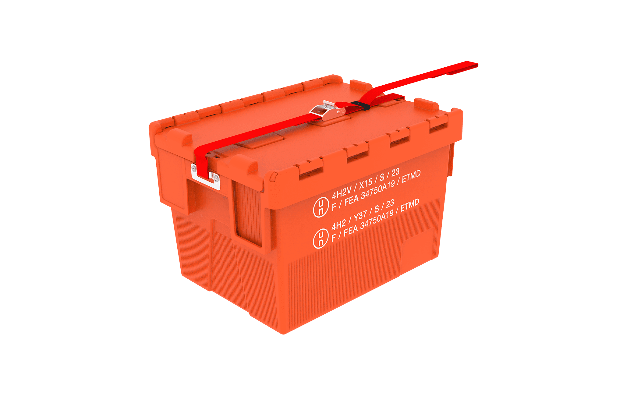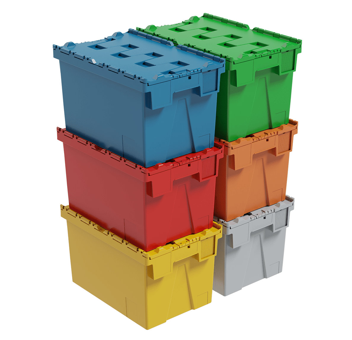 attached lid containers in multiple sizes, designed for secure, stackable, and reusable transit solutions across manual and automated logistics systems