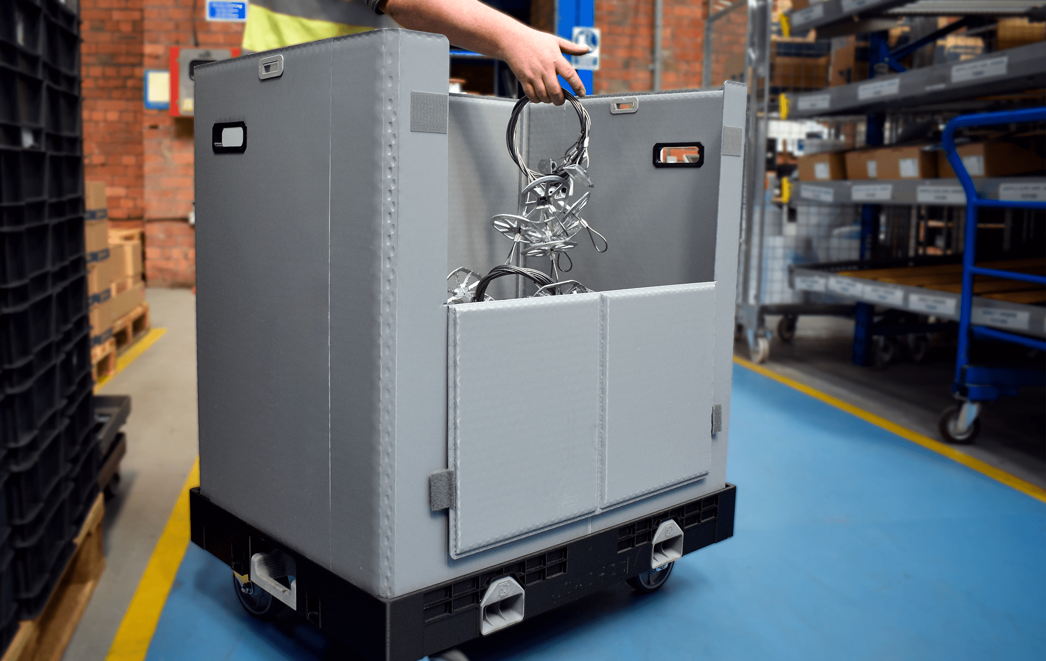 The unit presents no sharp metal touch points unlike roll cages, it doesn’t require MHE unlike pallet shippers and the ease of brake application ensures the brake is always applied.